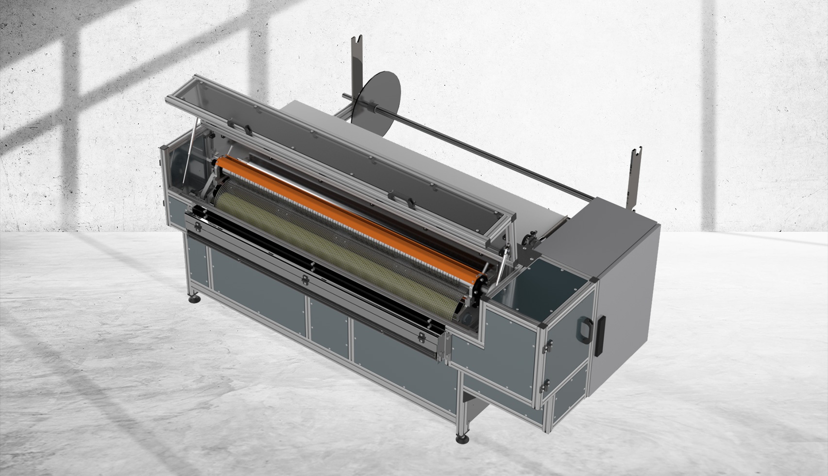- Am Auslauf wird das geschnittene Material über den Legetisch abgelegt oder mittels einer Aufwickeleinheit wieder zu Rollen gewickelt.