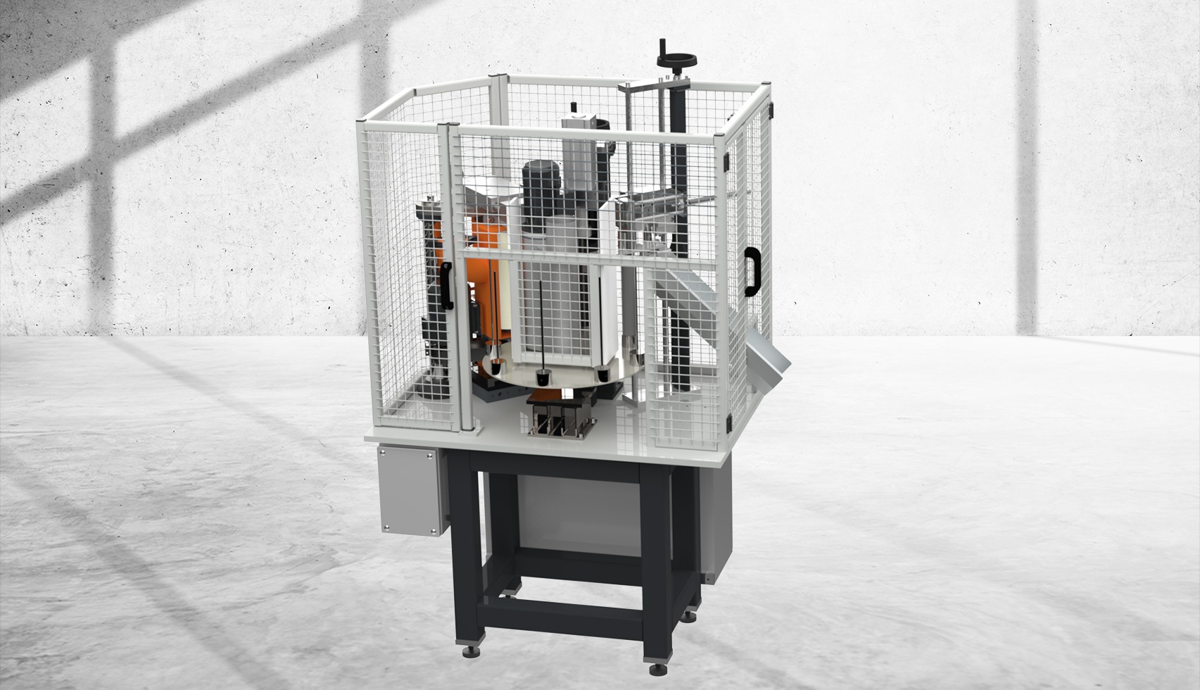 The paint roller and plastic parts are manually placed on the mandrels of the rotary horizontal carousel by an operator and is transported to the following working position on the carousel.