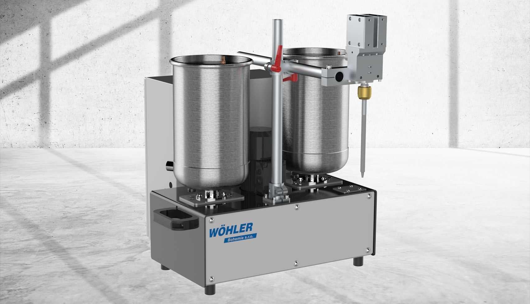 By means of two precision gear pumps the machine dispenses the pre-set mixing ratio by a chain-drive. The flow rate is infinitely variable by means of adjusting the no. of revolutions on the frequency converter and by adjusting the cycle time in the electronic control.